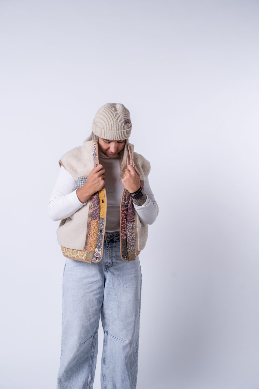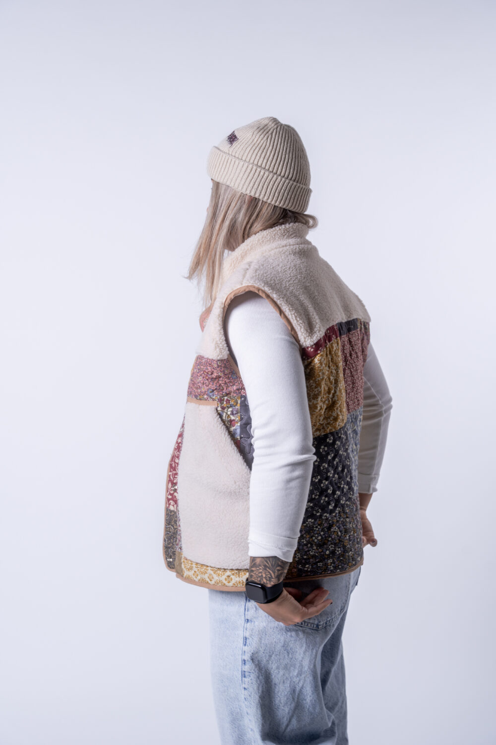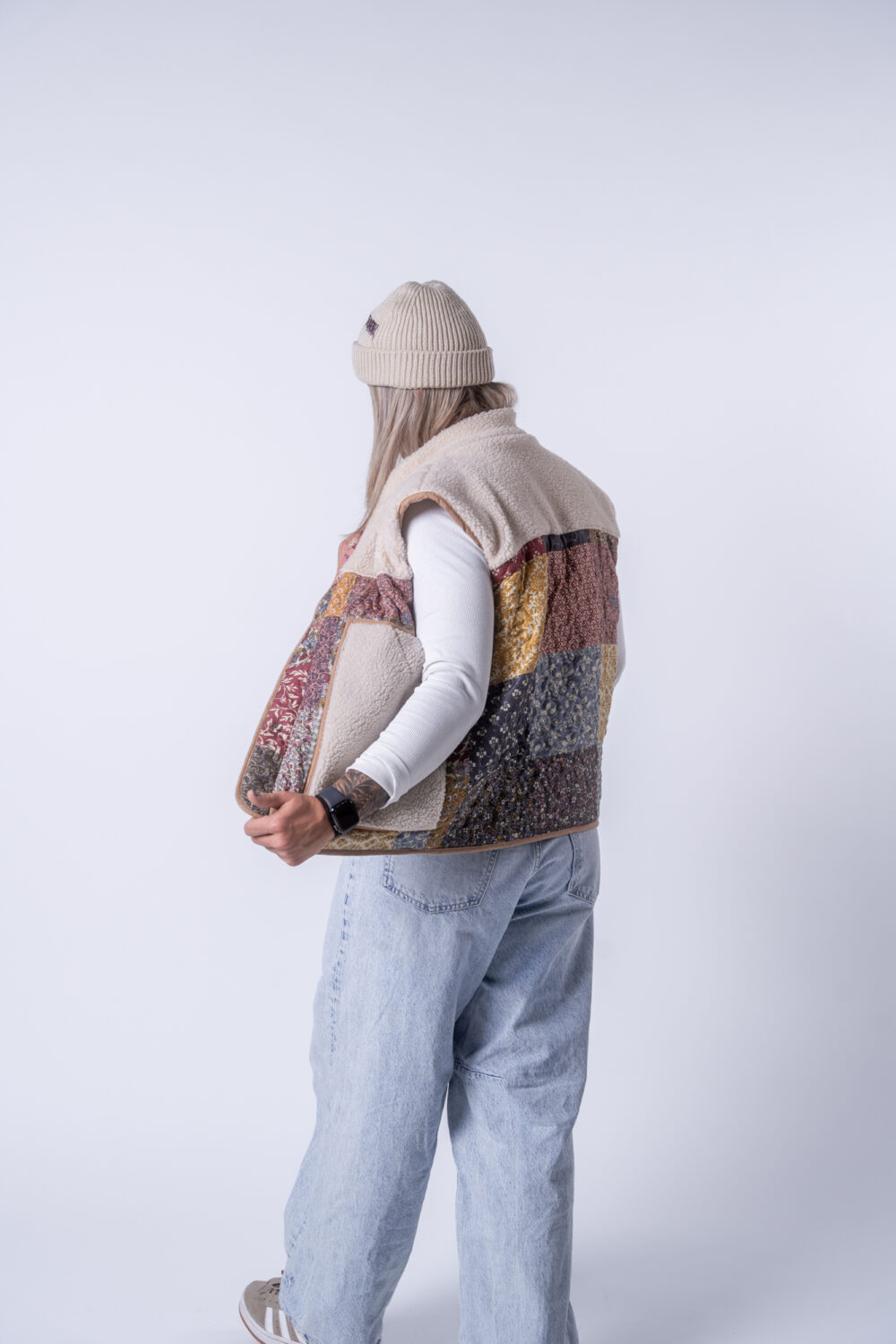 This vest is like a hug you can take anywhere. The insulated fleece keeps you cozy, recycled materials add uniqueness, and every design is a little original on its own.