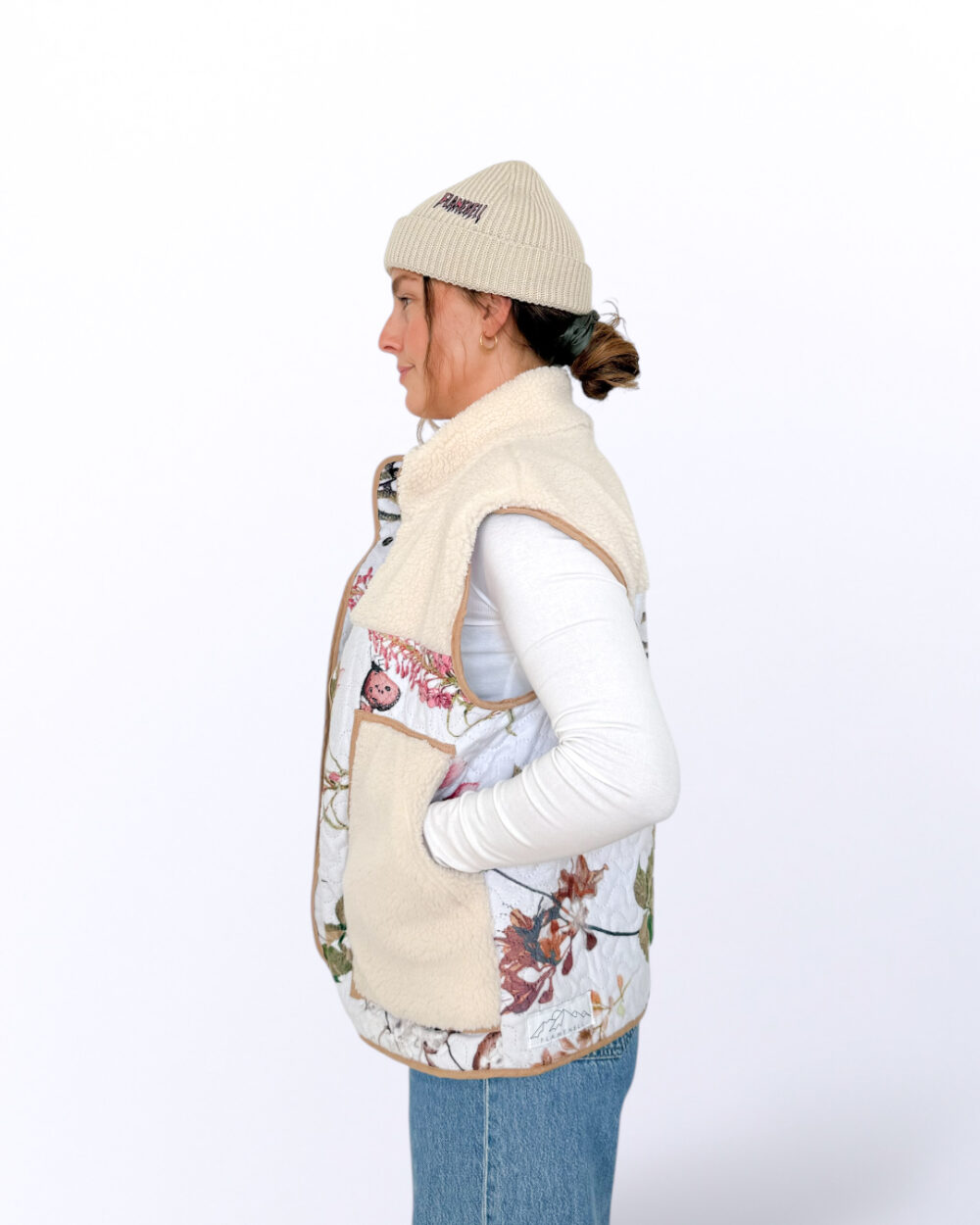This vest is like a hug you can take anywhere. The insulated fleece keeps you cozy, recycled materials add uniqueness, and every design is a little original on its own.