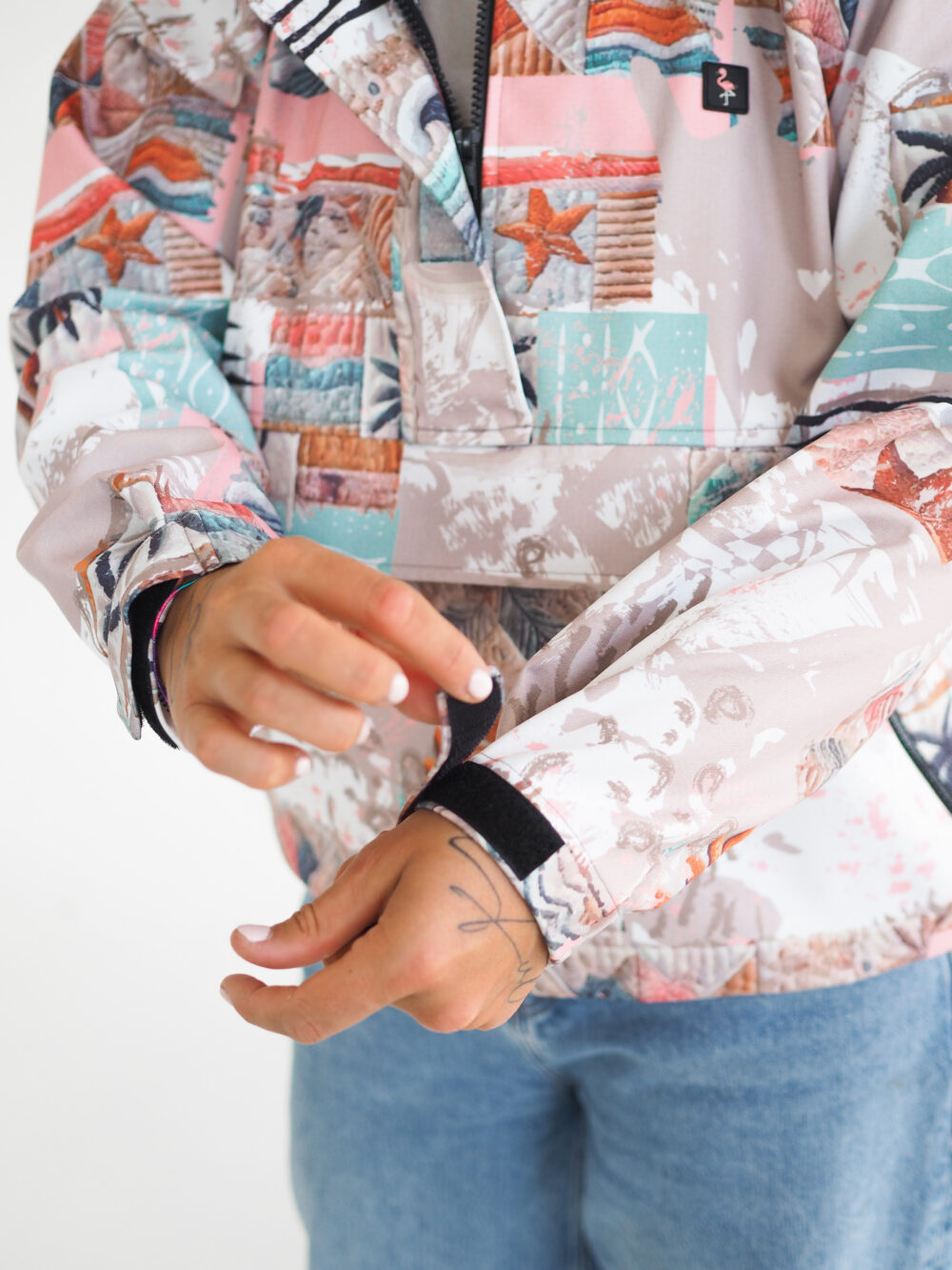 It protects you, keeps you warm, and still lets your skin breathe. Thanks to its three-layer construction with a membrane, it’s a reliable partner when the weather changes several times a day. The outer layer is strong and abrasion-resistant, so you don’t have to worry about a backpack or heavier use. The inner side has a black-and-white checkered knit, which provides light thermal comfort – just enough to keep you warm in the mountains in the morning, without overheating during activities later in the day.